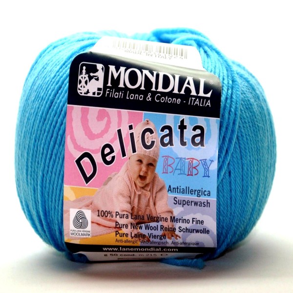 Delicata lana de bebe de Mondial, 100% pura lana virgen, antialergica y lavable para agujas nº2,5-3, 50gr, 215m